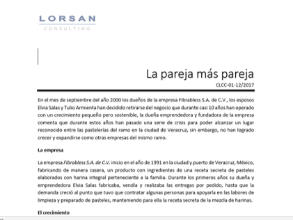 En el mes de septiembre del año 2000 los dueños de la empresa Fibrabless S.A. de C.V , los esposos Elvia Salas y Tulio Armienta han decidido retirarse del negocio que durante casi 10 años han operado con un crecimiento pequeño pero sostenible, la dueña emprendedora y fundadora de la empresa comenta que durante estos años han pasado una serie de crisis para poder alcanzar un lugar reconocido entre las pastelerías del ramo en la ciudad de Veracruz, sin embargo, no han logrado crecer y expandirse como otras empresas del mismo ramo. En el año 2000 Elvia y Tulio consideran las ofertas de los posibles compradores del negocio, sin embargo, no son lo suficiente atractivas para entregar lo que ha sido su vida durante esos años. Proponen a los colaboradores la posibilidad de entregarles la empresa a manera de liquidación por sus años de servicio, los empleados se han reunido y deben evaluar esta situación.